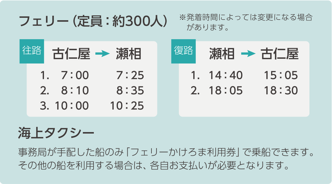 加計呂麻島の島外からの参加者は申し込み時の参加料にフェリー利用料(往復分)が含まれています。選手受付時(事前引換)にてお渡しする『フェリーかけろま利用券』で古仁屋~瀬相を船移動していただきます。 応援者のフェリーチケットは、チケット売り場ではなく「せとうち海の駅(古仁屋)【フェリー発着所】」に設置している事務局受付で購入してください。