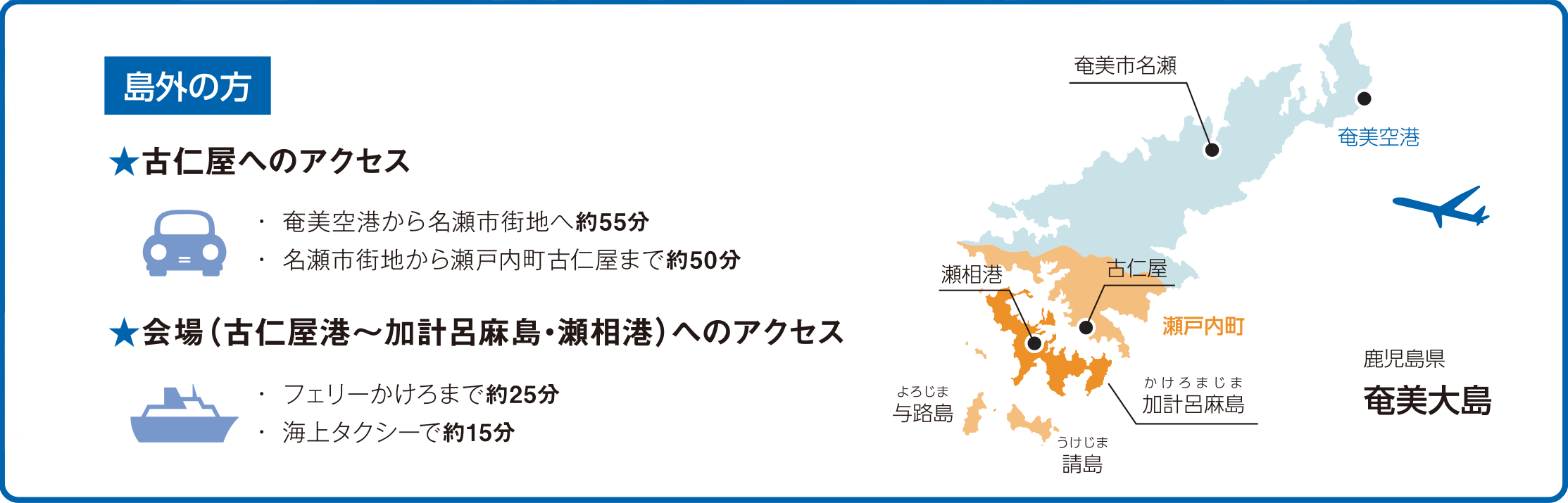 瀬戸内町古仁屋へ | レンタカーまたはバスで 奄美空港から約2時間、名瀬港から約1時間 |