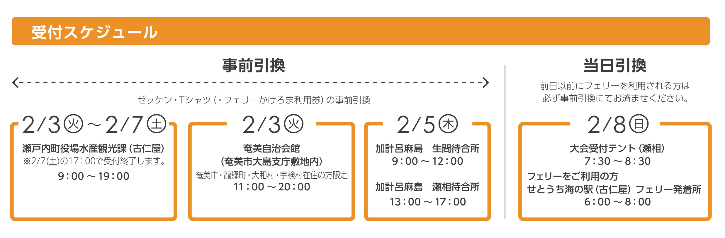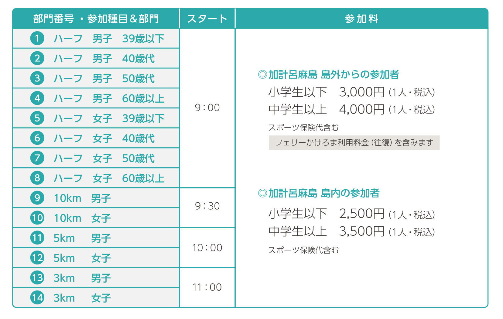 加計呂麻島の島外からの参加者は申し込み時の参加料にフェリー利用料(往復分)が含まれています。 選手受付時(事前引換)にてお渡しする「フェリーかけろま利用券」で古仁屋~瀬相を船移動していただきます。 応援者のフェリーチケットは、チケット売り場ではなく「せとうち海の駅(古仁屋)【フェリー発着所】」に設置している事務局受付で購入してください。 (大人360円、大人往復690円、小人180円) |